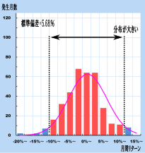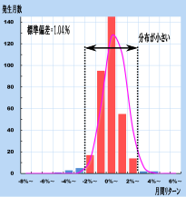 実際に日本株式と日本債券のリスク(標準偏差)を測ってみると、日本株式は日本債券に比較して5倍近いリスクになっており、リスクの大きさはリターンの分布の程度を表わしています。 |